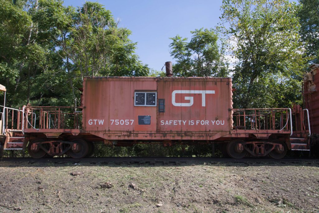 Converted from an older boxcar, GTW 75057 represents the practical adaptations railroads made to extend equipment life during a period of declining caboose use. Its distinctive orange paint scheme and weathered patina reflect authentic years of service on Midwestern rails. Now standing proudly amid the natural surroundings of our Grand Rapids, Ohio facility, it serves as a tangible link to the history of freight rail operations.